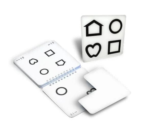 Ce test sert à mesurer l’acuité visuelle de loin des enfants de 19 à 36 mois. Les optotypes LH isolés sont tenus comme un livre.
