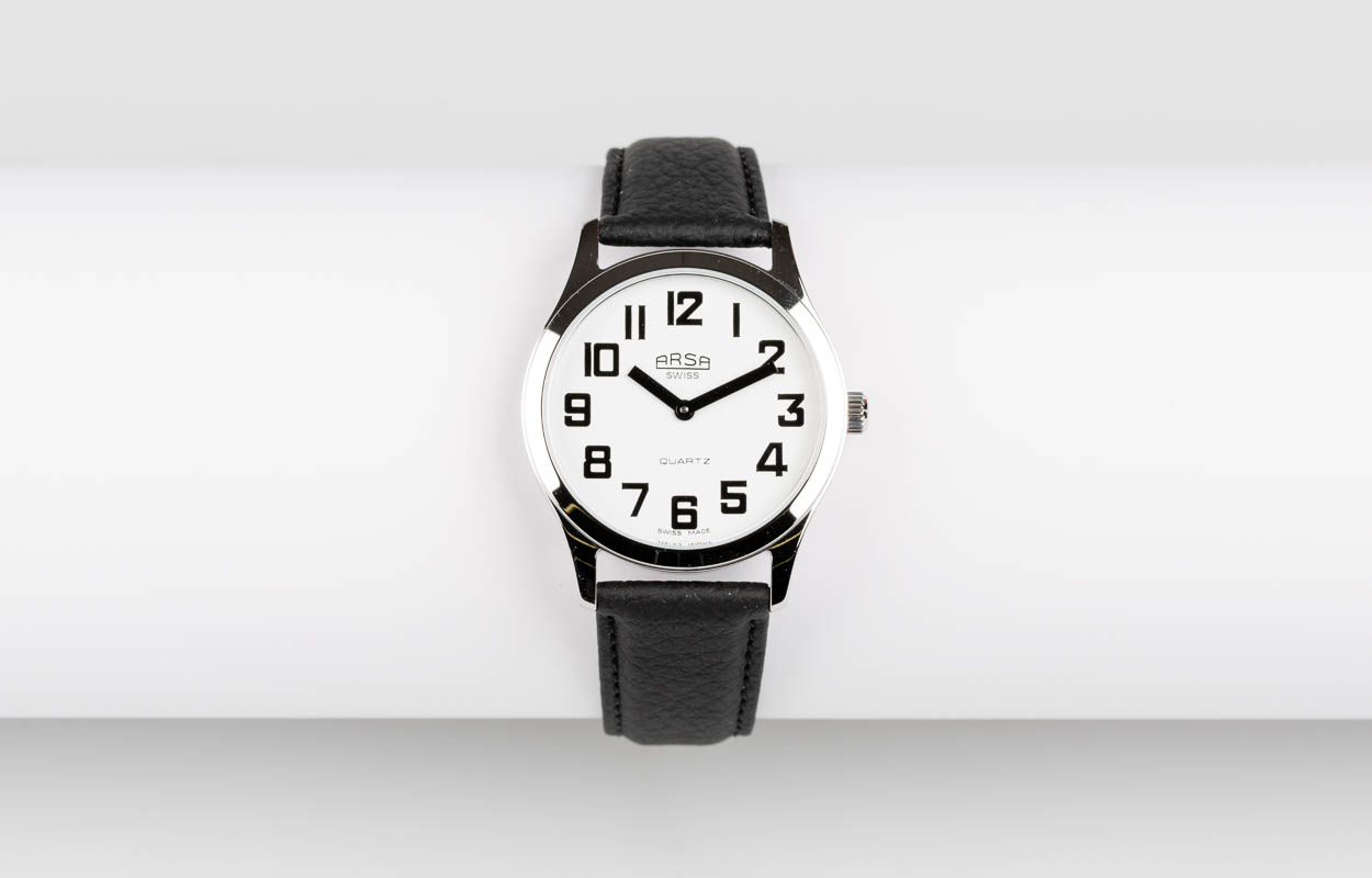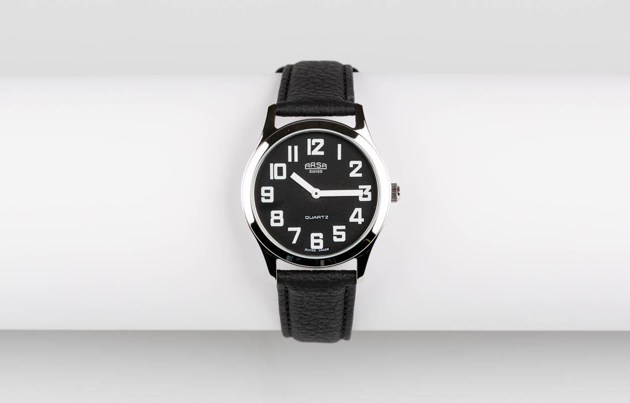 Kontrastreiche Low-Vision Uhr mit verchromten Konturen