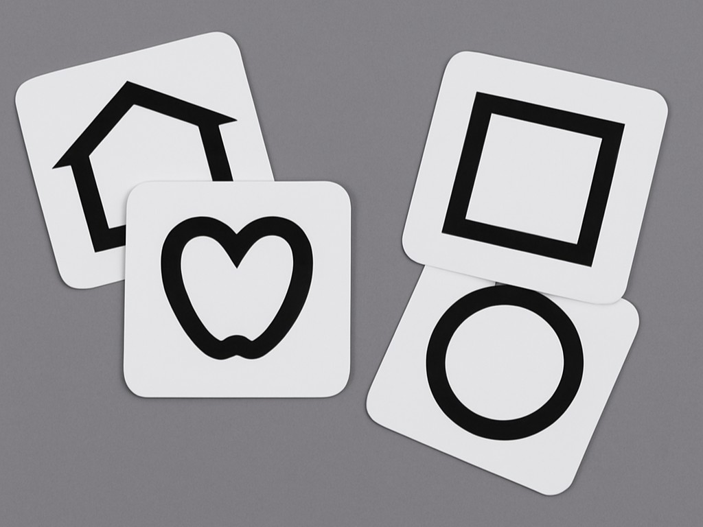 Vier Ersatz-Antwortkarten in quadratischem Format, jeweils bedruckt mit einem der vier Lea-Symbole.