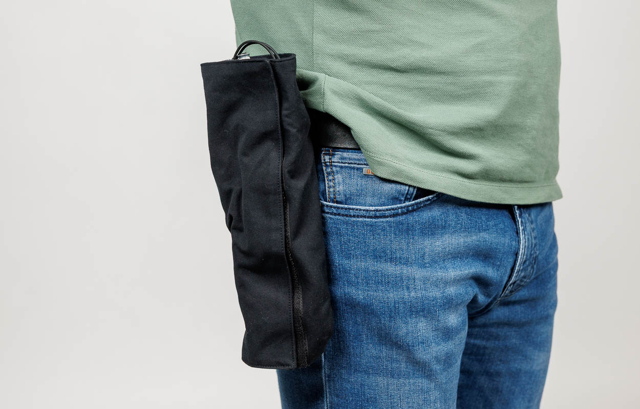 Der faltbare Langstock kann in die Tasche verstaut und mit Klett fixiert werden.